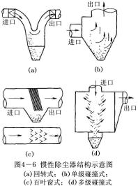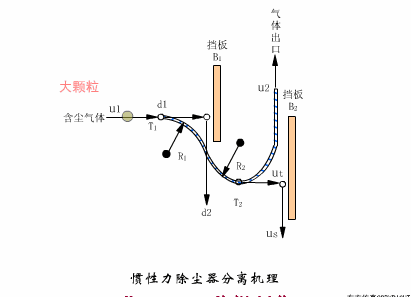 慣性除塵設(shè)備分為碰撞式和回轉(zhuǎn)式兩種。前者是沿氣流方向裝設(shè)一道或多道擋板,含塵氣體碰撞到擋板上使塵粒從氣體中分離出來(lái)。顯然,氣體在撞到擋板之前速度越高,碰撞后越低,則攜帶的粉塵越少,除塵效率越高。后者是使含塵氣體多次改變方向,在轉(zhuǎn)向過(guò)程中把粉塵分離出來(lái)。氣體轉(zhuǎn)向的曲率半徑越小。轉(zhuǎn)向速度越多,則除塵效率越高。